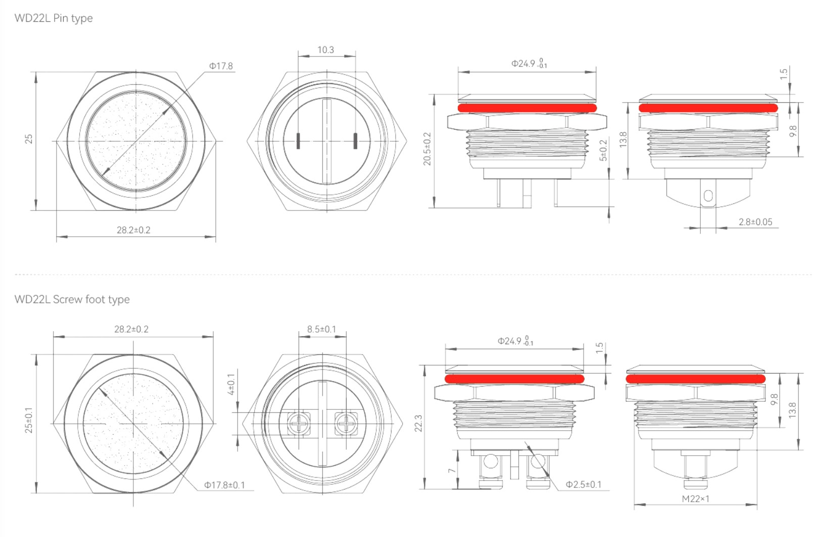 •             WD22L-P1-R-1 Luces indicadoras de metal WD22L-P1-R-1
