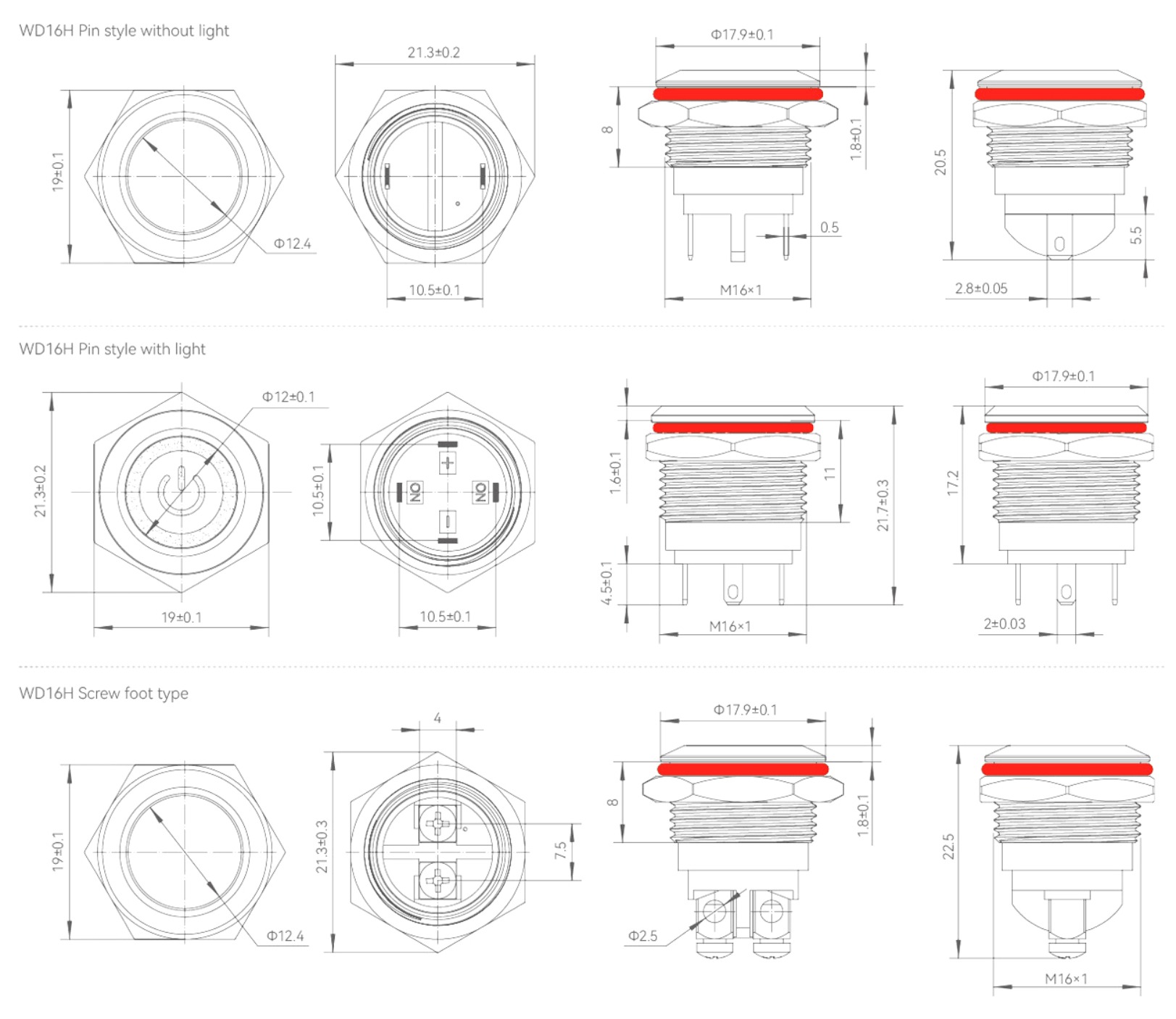 •             WD16H-P1-EC-□□-S-1 Interruptores de botón metálicos WD16H-P1-EC-□□-S-1